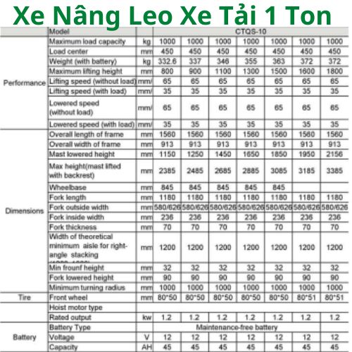 Thông số kỹ thuật xe nâng tự leo 1 tấn (tham khảo)